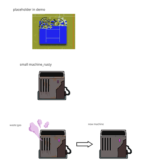 For the machines, I designed a square-shaped model and split its sprite into different states (active/inactive/rusted/emitting gas).